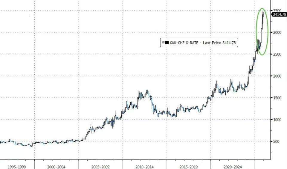 (过去20年,以瑞士法郎计价的黄金价格累涨超80%)