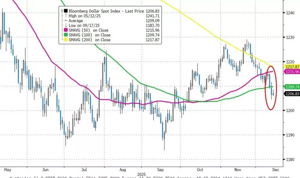高盛外汇团队对2026年的预测显示美元将大幅贬值。实际上美元指数已经显现疲态,连续三周收跌,12月以来接连跌破50日和200日均线、回落至接近3个月低点。